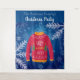 Ein Wandteppich für eine lustige Urlaubssaison und Weihnachten Party, Abendessen. Ein blauer Hintergrund mit großen weißen Schneeflocken, Kristallen. Die Dekoration ist mit einem üppig roten, weißen, orangen und grünen Weihnachtspulli verziert. Personalisieren Sie Ihren Familiennamen und fügen Sie ihn hinzu. Der Text: Das Weihnachtsgebäck ist in Weiß mit einem modernen, handgeschriebenen Stil geschrieben. Kann als Begrüßungsschild, Party-Wanddekoration oder als Foto-Standfläche verwendet werden.