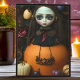 Senden Sie ein gruseliges Halloween-Gruß mit dieser gotischen Puppenkarte in einem unheimlichen, surrealen und schönen Stil. Traditionelle Orange und Schwarz mit blutroten Bändern, vergoldete Kürbisse und antiker Schmuck machen dieses creepycute Mädchen zu einem einzigartigen Besucher für die Sportsaison.