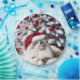 Eine flauschige Ragdoll-Katze mit auffallend blauen Augen trägt eine Weihnachtsmannmütze, die elegant vor einem Weihnachtsbaum sitzt, der mit rot-weißen Ornamenten verziert ist