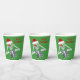 Diese Papiertassen sind grün mit winzigen Goldgräben und einem lustigen Skelett, das rote und grüne Schneeflocken mit einer roten Weihnachtsmannmütze und einem fröhlichen Weihnachtstext vorne und hinten in Rot hält.