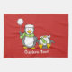 Ein kleiner Pinguin-Cartoon mit Schneeball und einem ohnmächtigen. Beide tragen grüne Schals und Weihnachtsmannmützen.