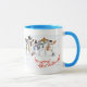 Eine weiße Ringer-Tasse mit puderblauer Felge und Griff und fünf fröhlichen Schneemännern auf der Vorder- und Rückseite, von einem handbemalten Aquarelldesign von Judy Adamson. Dieses Design ist auch als Weihnachtskarte erhältlich.