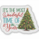 Ein lebhafter und farbenfroher quadratischer Aufkleber, der die Ferienzeit feiert, beherbergt einen wunderschön dekorierten Weihnachtsbaum mit Ziergegenständen und Bonbons.