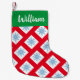 Schneeflocken in Blau auf einem Hintergrund von leuchtend rot bedecken diesen Strumpf. Passen Sie den Namen der Initialen Ihres Lieblings-Elfs an.
