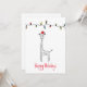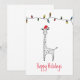 Whimsikale Giraffe-Illustration mit roter Weihnachtsmannmütze, einer Reihe von Urlaubslichtern und anpassbarem Text "Happy Holidays"