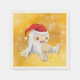 Ein Set aus Papier-Servietten mit einer Abbildung eines niedlichen kleinen Weihnachtsyeti, Spielzeug-Puppe, mit einer roten Weihnachtsmannmütze. Der kleine Yeti hat eine Pull-Kette, um ihn reden zu lassen, und er ist mit weich weißem Fell mit hellbraunen Akzenten bedeckt. Hintergrund ist ein goldenes Buch-Design mit schimmernden, verschwommenen Lichtern.