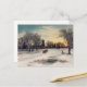 Eine Winterlandschaft vereint eine ruhige Landschaft mit einem Pferd gezeichnet Schlitten, der durch eine schneebedeckte, von Bäumen gesäumte Dorfstraße gleitet. Im Hintergrund steht eine Kirche unter einem Halbmond in einem lebendigen Sonnenuntergangshimmel.
