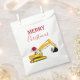 Eine niedliche Abbildung eines gelben Spielzeuggrabens mit einer Weihnachtsmannmütze und in Weihnachtsbeleuchtung dekoriert, der Weihnachtsgeschenke mit den Worten "Frohe Weihnachten" ausgräbt. Ideal für Baulaster jeden Alters. Eine ideale Weihnachtsgeschenktüte für Groß oder Klein, Mädchen oder Jungen.