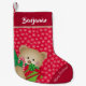 Bereiten Sie sich mit diesem bezaubernden Weihnachtsfeiertag auf den Weihnachtsmann vor. Strumpf mit einem Teddybär, der einen grünen Schal trägt und Weihnachtsgeschenke und einen Bonbonstock trägt. Der Hintergrund ist rot und weist weiße, fallende Schneeflocken auf. Auf der anderen Seite befindet sich ein dunkelrotes Band mit goldener Grenze und Platz für deinen frohen Weihnachtsgrüß und den Namen deines Kindes.