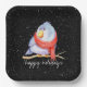 Niedlicher Aquarellvogel mit Winterschal und Happy Holidays Text auf schwarzem Hintergrund mit Schneeflocken. Die Hintergrundfarbe kann geändert werden. Text ist bearbeitbar.