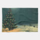 Vintage Abbildung Viktorianisch Frohe Weihnachtsfeiergestaltung mit schneebedeckter Landschaft. Eine Schneefall mit einem Weihnachtsbaum, der an einem Winterabend mit hellen Lichtern geschmückt ist, mit einem sternhaften Nachthimmel und Schnee auf dem Boden. Glückliche Feiertage und Grüße der Saison!