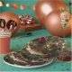 Nah von einem voll dekorierten Weihnachtsbaum mit Baubles und Trompetenschmuck, Band und Lichtern auf Party-Produkten und Gefallen.