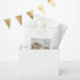 Das Design zeigt ein Foto von Weihnachtsgeschenken auf weißem Hintergrund.