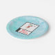 Papier Teller mit einer niedlichen skurrilen Illustration eines lustigen Weihnachtsrentiers in einem hässlichen Pullover, perfekt für die Ferienzeit. Er ist auf 2 Beinen stehend und winkt hallo. Er hat große Geweihe und eine niedliche, grün gestrickte Wintermütze. Im folgenden Text heißt es frohe Weihnachten in einem handgeschriebenen Schriftart in festlich roter Farbe. Der Hintergrund ist ein blaues, frostig aussehendes Aquarelldesign.