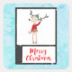 Aufkleber mit einer niedlichen skurrilen Illustration eines lustigen Weihnachtsrentiers in einem hässlichen Pullover, perfekt für die Ferienzeit. Er ist auf 2 Beinen stehend und winkt hallo. Er hat große Geweihe und eine niedliche, grün gestrickte Wintermütze. Im folgenden Text heißt es frohe Weihnachten in einem handgeschriebenen Schriftart in festlich roter Farbe. Der Hintergrund ist ein blaues, frostig aussehendes Aquarelldesign.