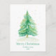 Eine frostige Winterlandschaft umrahmt einen Weihnachtsbaum in Aquarellen, der mit glitzernden Schneeflocken und goldenen Akzenten geschmückt ist, um ein schlichtes, aber elegantes Design zu schaffen.