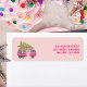 Illustration eines rosa RV mit Weihnachtsbaum an der Spitze befestigt. Der Hintergrund ist rosa.