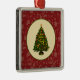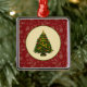 Feierliches Muster mit einem reich verzierten Weihnachtsbaum auf einem cremefarbenen Hintergrund mit rot-cremefarbener Hütte um die Grenze herum.