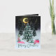 In einer schneebedeckten Nachtszene befindet sich ein Weihnachtsbaum mit bunten Lichtern, umgeben von großen immergrünen Bäumen. Der Halbmond strahlt in den Himmel, und am Fuß des Baumes werden Geschenkboxen mit einer festlichen "Frohen Weihnachten"-Nachricht arrangiert. Handgezeichnet in Procreate mit so viel Liebe.