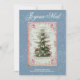 Ein altes Weihnachtsbaum-Label Kunst-Illustration-Overlay auf einem Aquarellschnee-Hintergrund in tiefblauem und weißem Weiß. Auch die Schneeszene auf der Rückseite. Eine saisonale Karte mit einer sanften, ruhigen Naturlandschaft für ein gemütliches, gemütliches Ambiente.