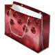 Desteis originelle Illustration von rot-goldgelben Weihnachtsbaubeln, die ein Schneeflockenmuster auf ihnen haben. Der Hintergrund ist ein hübscher roter Bukett. Es gibt auch zwei personalisierbare Textbereiche.