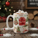Diese Tasse bietet eine Reihe von Aquarellbildern von Weihnachtsbäumen und Geschenke in einem Umriss.