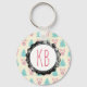 Ein stilvoller Retro-Schlüsselanhänger mit einem Vintagen Grunge-Stil mit Monogramm-Initialen in der Mitte. Das Hintergrunddesign ist ein festliches Weihnachtsmuster in cremefarbener Farbe. Illustrationen von pastellfarbenen, grün-blauen, Weihnachtsbäumen und pastellrosa Bausteine und Bögen in einem sich wiederholenden Muster.