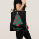 Diese schwarze Tasche enthält einen niedlichen Weihnachtsbaum mit Ihrem Namen darunter. Auf der Rückseite "Frohe Weihnachten" mit einem allgegenwärtigen Weihnachtsbaummuster. Ein tolles, praktisches Geschenk in dieser Urlaubssaison. Um den Text oder das Bild zu ändern, klicken Sie auf die Schaltfläche Personalisieren. Dieses Design enthält A.I.