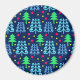 Grüne, blaue und türkisfarbene Weihnachtsbäume mit gelbem und rotem Schnee auf dunkelblauem Hintergrund.