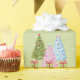 Weihnachtsbaumverpackungspapier mit einem grünen, blauen und rosa Baum, dekoriert, drei grüne Geschenke, und Imitate Schnee fällt. Dank der Hungryjpeg für einige Elemente in der Gestaltung.