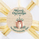 Beige Imitate prallen als Hintergrund, grüner Text. Frohe Weihnachten ist mit einem Retro-Schriftart geschrieben. Dekoriert mit einer Geschenkboxen mit Kiefernästen. Personalisieren und fügen Sie Ihren Familiennamen und ein Jahr. Ein Einbruchbild, kein echter Stoff.