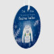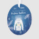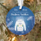 Ein blauer Hintergrund mit großen weißen Schneeflocken, Kristallen. Mit einem hässlich weißen Weihnachtspulli dekoriert. Personalisieren und fügen Sie Ihren Familiennamen, das Jahr und einen Titel hinzu. Der Text: Weihnachten Tradition ist in Weiß geschrieben mit einem modernen handgeschriebenen Schriftsatz. Ein Ornament als Pfand für Ihre erste Weihnachtszeit als Familie.