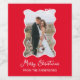 Diese bezaubernden Ferienweinetiketten zeigen Ihr Lieblingsweinetikett in einem angesagten, weißen, welligen Rahmen mit einem Knorpelbogen auf festlichem rotem Hintergrund. In einem modernen Drehbuch steht "Frohe Weihnachten".