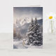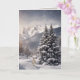 Schneebedeckte Pinienbäume und Berggipfel mit Schneeflocken und Sonnenschein. Der Text kann geändert werden.
