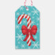 Feierliche und niedliche rot-weiße Cartoon-Illustration eines köstlichen Weihnachtskerzenstock mit einem schönen roten Bogen. Die Hintergrundfarbe ist blau mit einem Schneeflockenmuster. Auf der anderen Seite steht "Frohe Weihnachten!" zusammen mit einem anpassbaren Textbereich für die Namen des Geschenkempfängers und des Geschenkleifers.