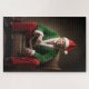 Ein Porträtbild von Donald Trump, der in einem braunen Lederstuhl sitzt und ein Weihnachtselkostüm trägt