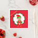 Niedlicher Weihnachtself, der eine Geschenkboxen im Zentrum eines Kieferkranzes hielt, der mit Poinsettien, roten Kugeln und einem Band geschmückt ist, umgeben von Sternen auf dem Rotweihnachtsbuch Napkin. Text kann personalisiert sein.