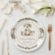 Teller aus weißem und cremefarbenem Party im klassischen aber modernen Bauernstil mit Kiefern, weiße Weihnachtsgebäck, Laterne und niedlichem Vogel. Die Mitte ist cremefarben, der Rand weiß. Personalisieren Sie den Text einfach. Kate Eden Art