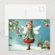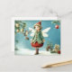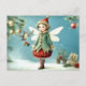 Eine süße, warm gekleidete Weihnachtsfee bekommt von einem Vogel ein Geschenk gebracht.