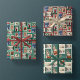 Set von drei individuell bedruckten Weihnachtsgeschenkblättern - zwei Blätter sind eine Collage von Weihnachtsfeiern, die u.s. zum Thema Post-Briefmarke gehört, eine mit tiefgrünem Himmelsbeerrot und eine mit wintergrünem Hintergrund. Das dritte Blatt ist eine Collage aus Retro-Weihnachtskarten