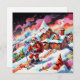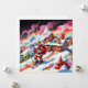 Das Bild ist ein generativer Inhalt. Was ich an diesem Bild mochte, ist, dass es aussieht wie Santa vom Lebkuchenhaus abfährt und auf dem Weg vom Haus aus ist. Auf der Rückseite ist bearbeitbarer Text. Ich fand es auch cool, dass er einen Skistopf in der rechten Hand hat.