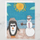 Ein Schneemann und ein Pinguin nehmen einen Urlaub am Strand.