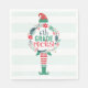 Festlicher Elf, der einen Weihnachtsschadenkranz hält. Der Elf trägt einen roten und goldenen Stern-Hut und Stripe-Strümpfe mit grünen Elfstiefeln.