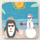 Ein Schneemann und ein Pinguin nehmen einen Urlaub am Strand.