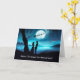 Eine Hochzeitskarte zum Weihnachtsabend mit einem romantischen Paar, das gegen das Mondlicht schweift, wobei das St. Nick im Hintergrund seine Runden macht.