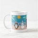 Ein Schneemann und ein Pinguin nehmen einen Urlaub am Strand.