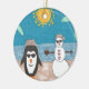 Ein Schneemann und ein Pinguin nehmen einen Urlaub am Strand.