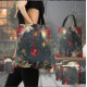 Ein Weihnachtswinterdesign mit dunkelgrünem Waldwald im Winter mit schimmerndem Goldschneeflocken, Poinsettias, leuchtenden Laternen, Kiefernzapfen und roten Beeren mit einem roten Ball-Ornament auf rotem Band, das auf eine voll bedruckte Tasche für die Ferienzeit fällt.