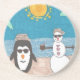 Ein Schneemann und ein Pinguin nehmen einen Urlaub am Strand.