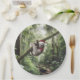 Ein Faultier mit einer Weihnachtsmannmütze und einem roten Schal hängt bequem von einem Ast inmitten eines üppigen, grünen Waldes
